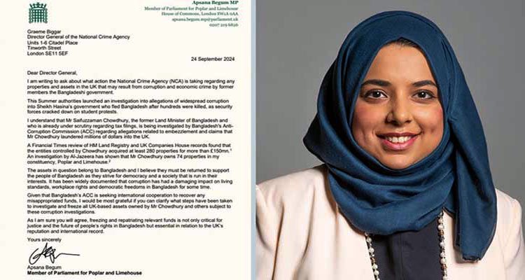 আপসানা বেগম চিঠিতে আরও উল্লেখ করেন, খুব দুঃখজনকভাবে ৭১ বাড়ির সন্ধান পাওয়া গেছে শুধু আমার নির্বাচনী এলাকা পপলার ও লাইম হাউজে। বাংলাদেশে দুর্নীতি দমন কমিশন (দুদক) এই বিষয়ে তদন্ত করছে। ব্রিটিশ সরকারও প্রতিশ্রুতি দিয়েছে বাংলাদেশকে পূর্ণ সহায়তা করার।