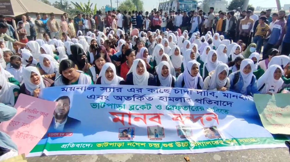 এরই প্রতিবাদে রোববার সকালে শিক্ষার্থীরা শিক্ষকের ওপর হামলার বিচারের দাবিতে সড়কে নেমে আসেন। তারা অভিযুক্তদের গ্রেপ্তারের দাবি জানান। বেলা ১১টার দিকে শিক্ষার্থীরা গাছের খণ্ড, টায়ার জ্বালিয়ে সড়কে যান চলাচল বন্ধ করে দেন। এতে সড়কের উভয় পাশে প্রায় দশ কিলোমিটার যানজটের সৃষ্টি হয়। পরে দুপুর ২টার দিকে ঘটনাস্থলে এসে সেনাবাহিনী অভিযুক্তকে গ্রেপ্তারের আশ্বাস দিলে শিক্ষার্থীরা সড়ক থেকে অবরোধ প্রত্যাহার করে নেন। পরে যানচলাচল স্বাভাবিক হয়।